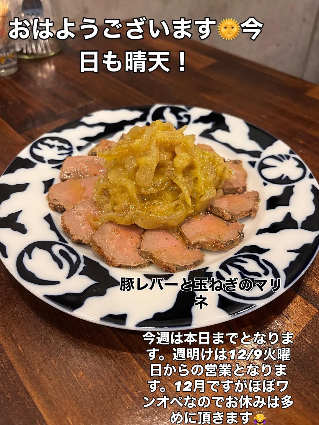 今週は本日土曜日までの営業となります!人気の豚レバーと玉ねぎのマリネです。